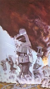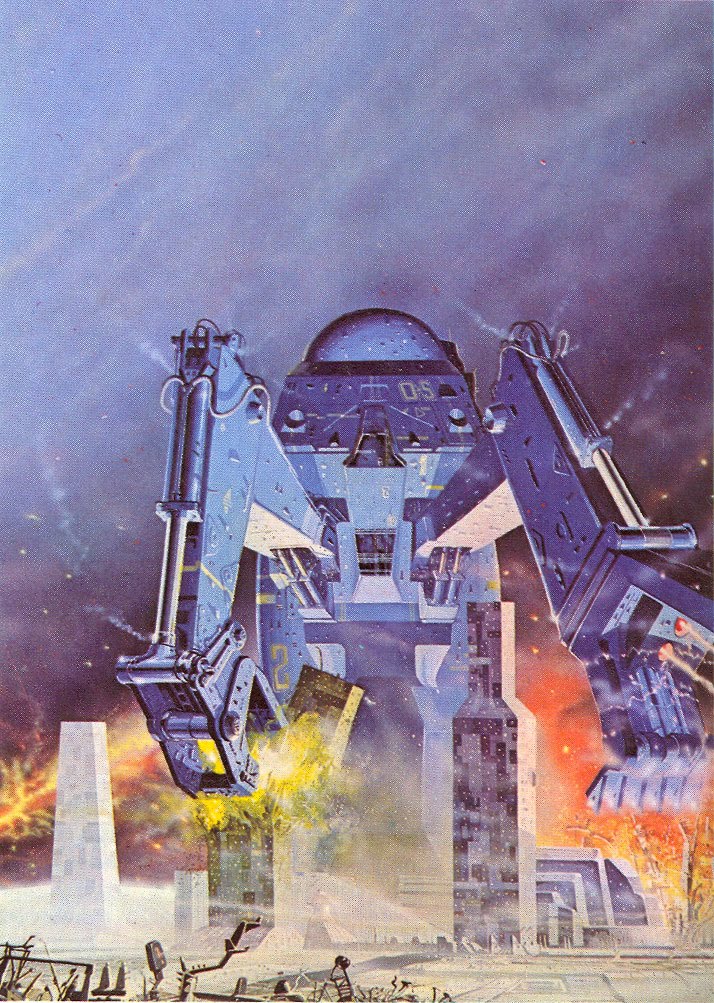 Scanned from one of my “Space Books.” (Click for much larger images.) Two by Angus McKee (top). (See Octopunk’s TBTBT2 post for two more by the same artist.) Sometimes That Big Thing Back There is leaving you alone, and sometimes it’s really not. Note also that one man’s Big Thing Back There is another man’s spiritual/religious artifact or monument (image #4) and, in a surprise twist, That Big Thing Back There turns out to be under the control of This Little Guy Up Here…because it’s just a “waldo” (Image #5). More to come…