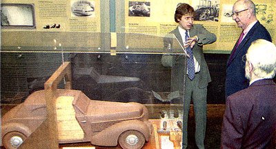 The Auburn Cord Duesenberg factory and showroom building (which is part of the national register of historical landmarks) has been turned into a classic car museum, and the museum (which stands on a street that has been renamed after my grandfather) received a grant last year from the Alcoa Corporation to create a special gallery honoring Gordon Buehrig and his contribution to the history of automobile design. This past weekend, the new gallery was formally opened: it features several of his most famous cars as well as his original drafting tools and other mementos from his work there. I created an exhibition for this new gallery, featuring a digital animation of the design of the Cord 810. I met with the museum directors last Labor Day to officially propose the project, and I’ve been laboring frantically over the past few months building a detailed digital model of the car, which is one of two reasons I’ve been absent from Horrorthon for so long. (The other is a book deadline, which is another headache.)